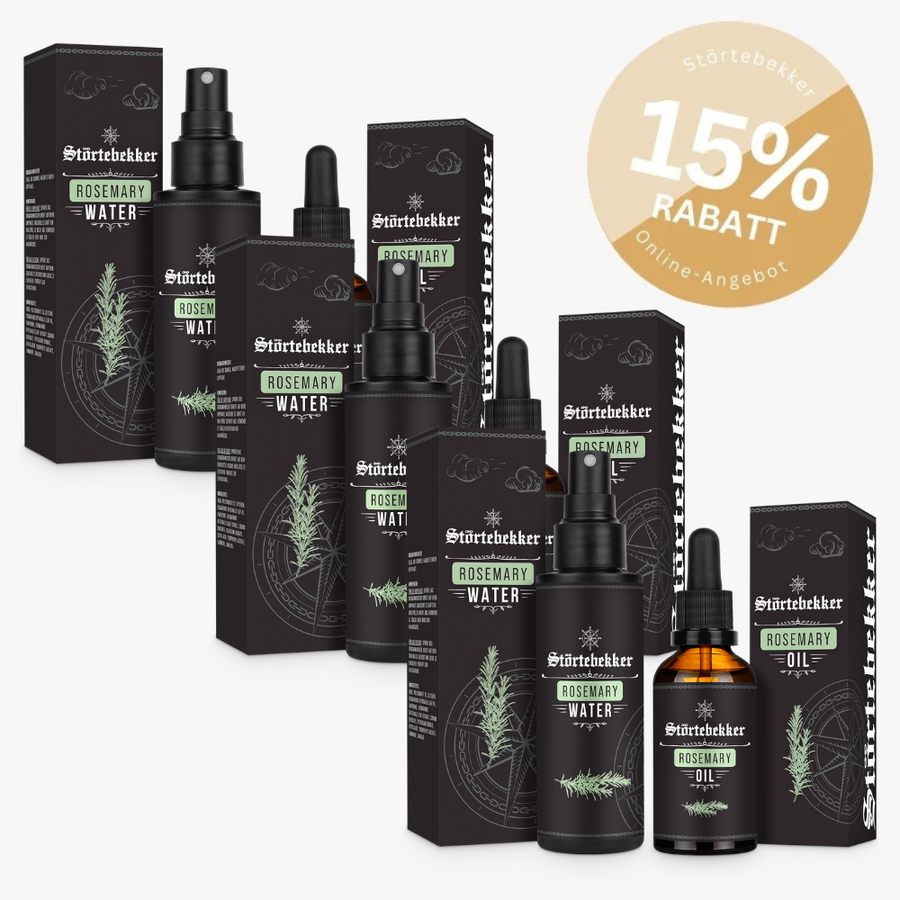 Rosmarinwasser erfrischt, beruhigt und versorgt die Kopfhaut täglich mit Feuchtigkeit. Das Rosmarinöl wirkt intensiver, pflegt tiefenwirksam und stärkt die Haarstruktur. Gemeinsam sorgen sie für gesünderes, kräftigeres Haar – von der Wurzel bis in die Spitzen.