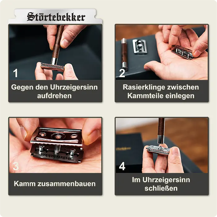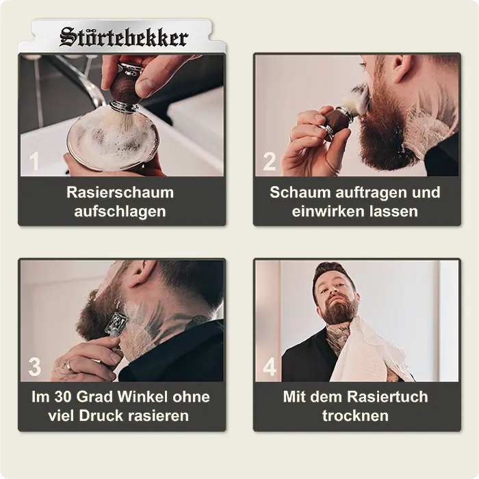 1. Schritt: Öffne die Poren, z.B mit einem warmen Handtuch 2. Schritt: Trage Rasierschaum auf und lasse ihn zwei Minuten einwirken 3. Schritt: Rasiere die Haare in einer gleichmäßigen Bewegung im 30 Grad Winkel. Rasiere ohne Druck, lasse die Klinge einfach über die Haut gleiten.In unserem Rasurguide beschreiben wir die perfekte Rasur im Detail.