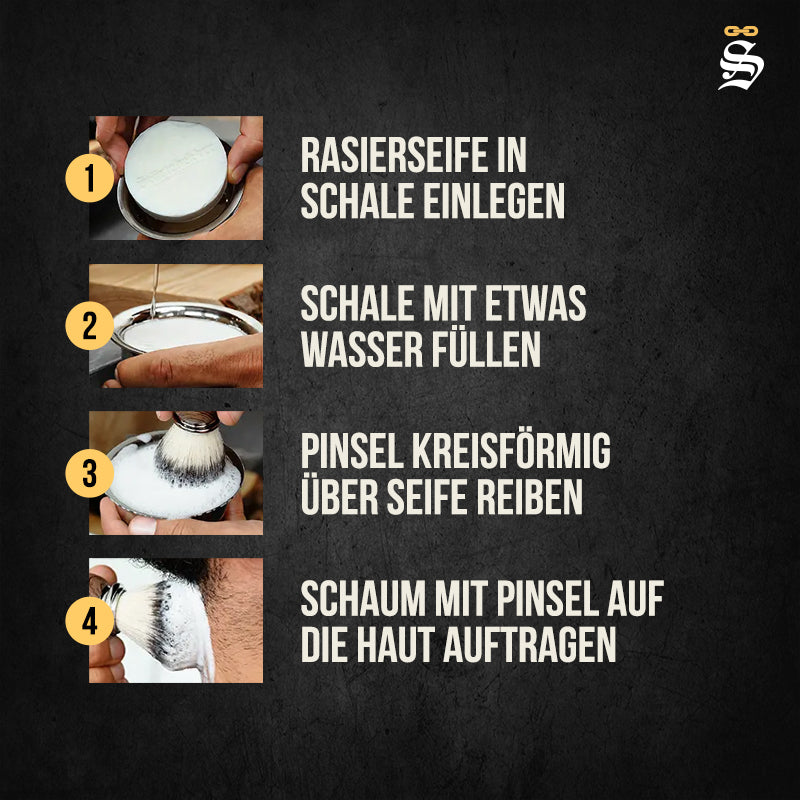 1. Schritt: Feuchte den Pinsel mit warmen Wasser an 2. Schritt: Lege die Rasierseife in die Schale, gebe ein klein wenig Wasser dazu und bewege den Pinsel mit etwas Druck in einer schnellen kreisförmigen Bewegung in der Schale 3. Trage den entstandenen Schaum auf und lasse ihn vor der Rasur 2 Minuten einwirken.