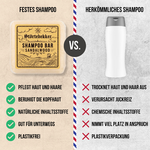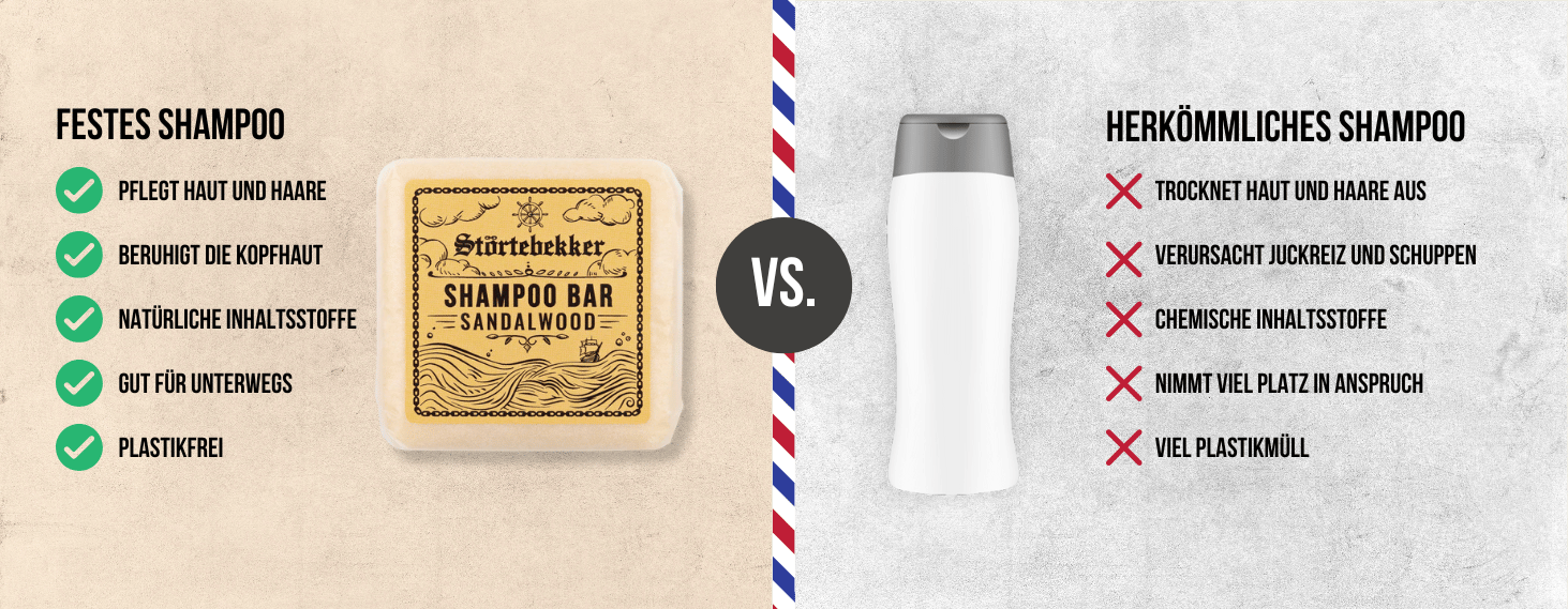 Umstieg auf das feste Shampoo von Störtebekker: natürliche Inhaltsstoffe, frei von Chemie, mit beruhigendem und frischem Duft.