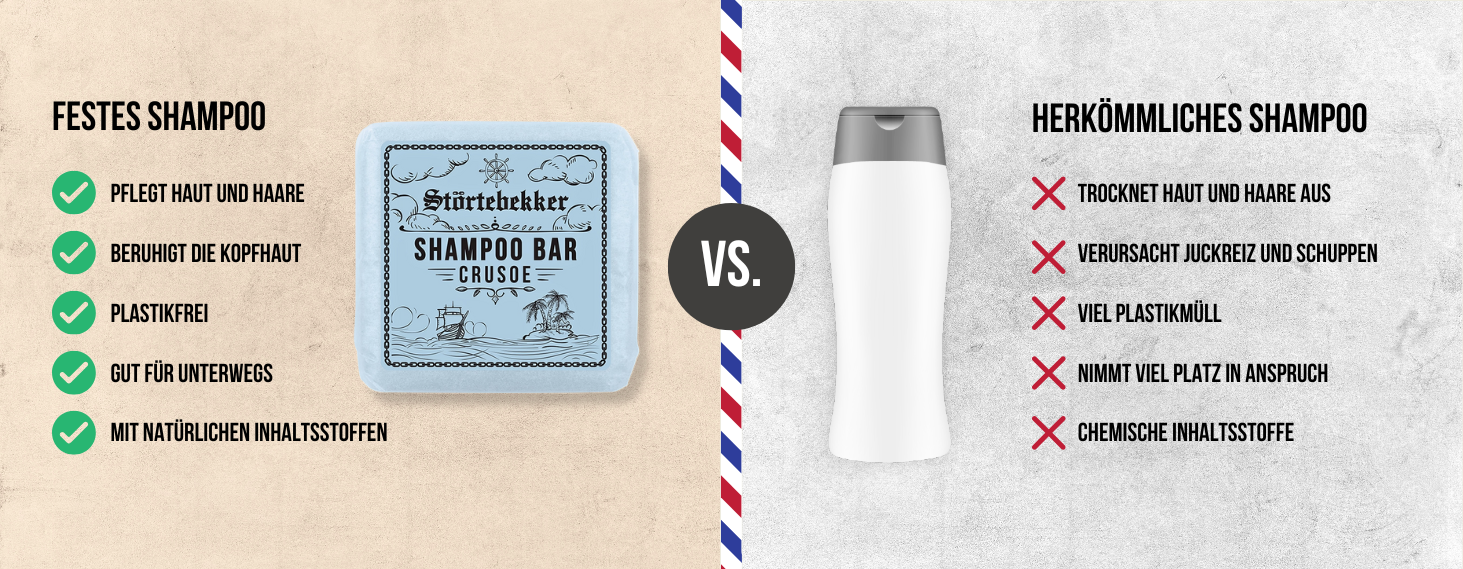 Umstieg auf das feste Shampoo von Störtebekker: natürliche Inhaltsstoffe, frei von Chemie, mit beruhigendem und frischem Duft.