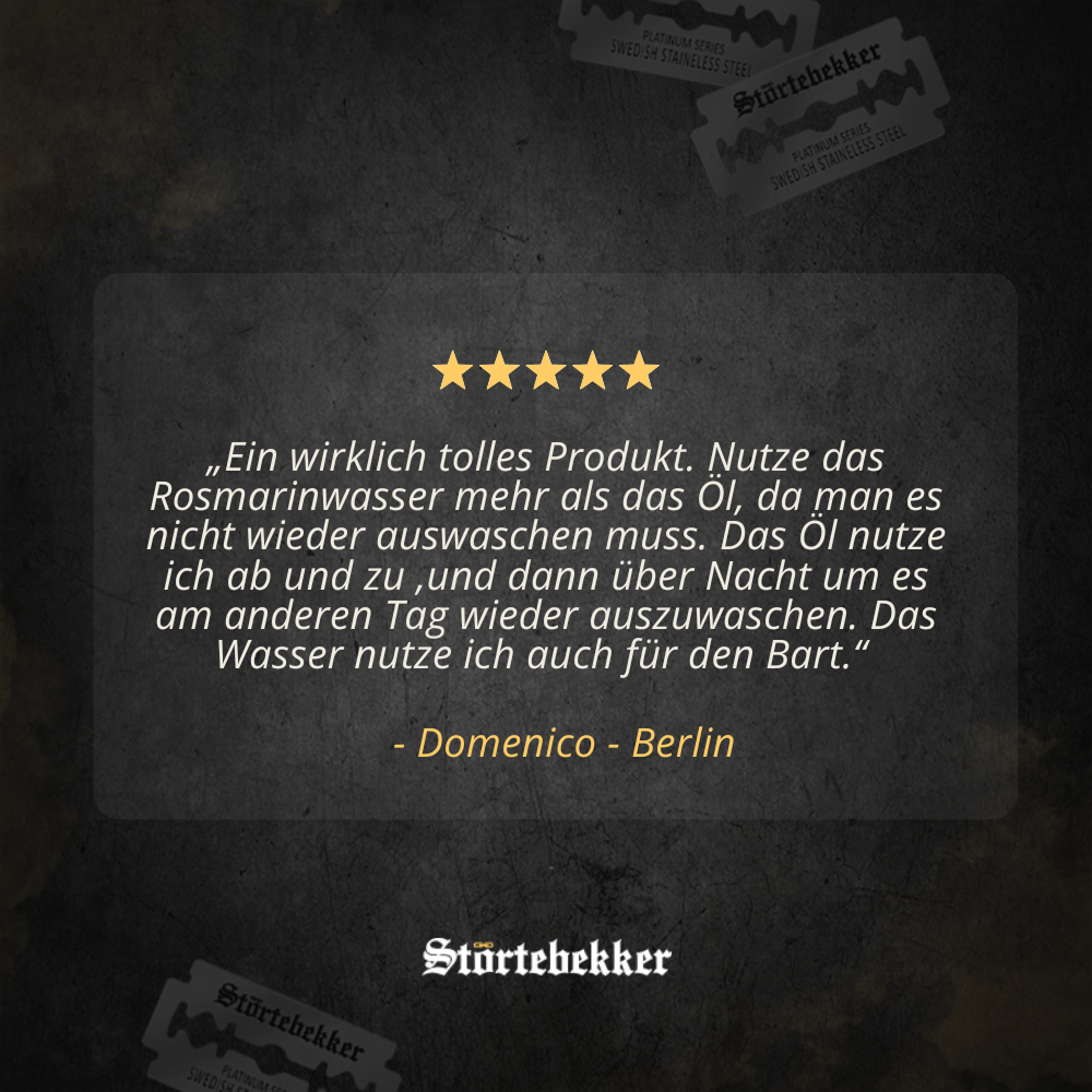 Du erhältst 1 Flasche Rosmarinwasser (125 ml) und zusätzlich einen kostenlosen Rasur- und Bartguide von Störtebekker.