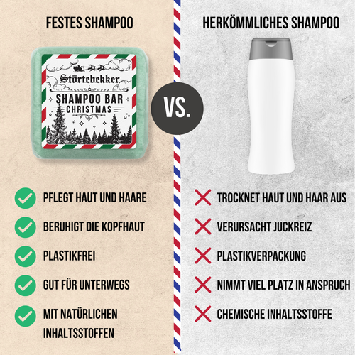 Dank der handlichen Größe und des quadratischen Designs ist unser festes Shampoo ideal für Reisen und unterwegs. Es kommt ohne unnötige Verpackungen aus und ist somit eine umweltfreundliche Alternative zu herkömmlichen Shampoos in Plastikflaschen. Unsere Weihnachts-Edition gibt als limitierte Auflage außerdem ein erstklassiges Geschenk ab!