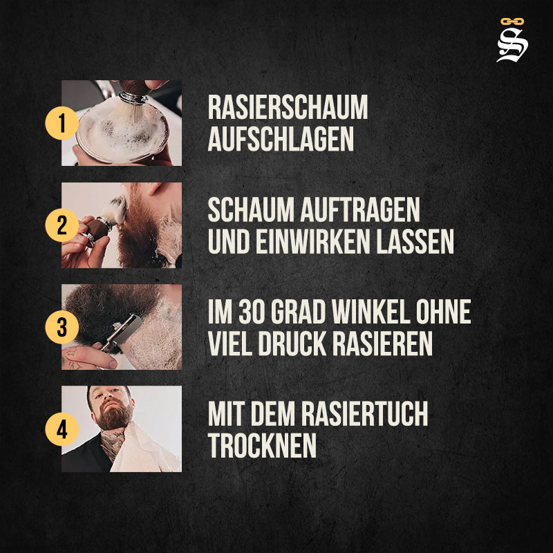 Genauso wie bei der Rasur mit dem Rasierhobel gibt es auch einiges bei dem Rasiermesser zu beachten. Wichtig ist vor allem die Pflege vor und nach der Rasur. Hierfür sollte man zunächst davor mit einem warmen Handtuch die Barthaare aufweichen. Hierdurch werden die Poren der Haut geöffnet. Das Einschäumen mit der Rasierseife sorgt zusätzlich für ein weiches Barthaar, sodass die Haare von der Klinge besser erfasst werden können. Wichtig ist auch, dass ohne jeglichen Druck rasiert wird. Also lieber mit wenig Druck mehrmals über die gleiche Stelle fahren, statt mit viel Druck alle Haare auf einmal entfernen zu wollen. Dadurch riskierst Du Schnittverletzungen und ein unreines Hautbild. Nach der Rasur solltest Du Dein Gesicht mit kaltem Wasser und Feuchtigkeit versorgen - beispielsweise durch eine Creme - da jede Rasur die Haut reizt. Um mehr über die perfekte Rasur zu lernen, bekommst Du zu jeder Bestellung einen kostenlosen Rasur- und Bartguide zum Download mit dazu.