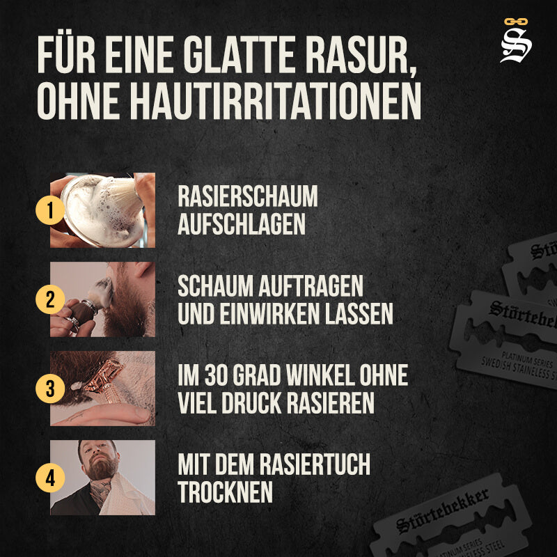 3. Schritt: Rasiere die Haare in einer gleichmäßigen Bewegung im 30 Grad Winkel. Rasiere ohne Druck, lasse die Klinge einfach über die Haut gleiten. In unserem Rasurguide beschreiben wir die perfekte Rasur im Detail.